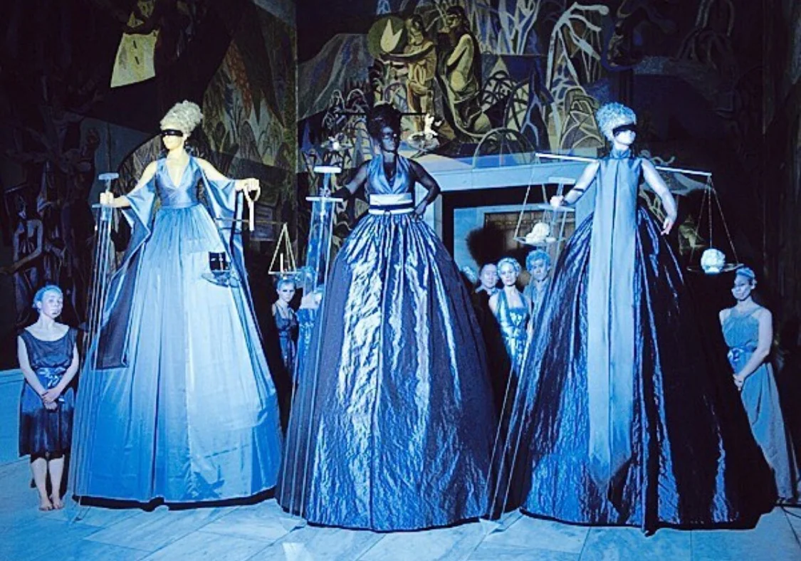 Justitiaene inntar Oslo Rådhus på stylter. Krevende koreografi for danserne, men helt uforglemmelig!